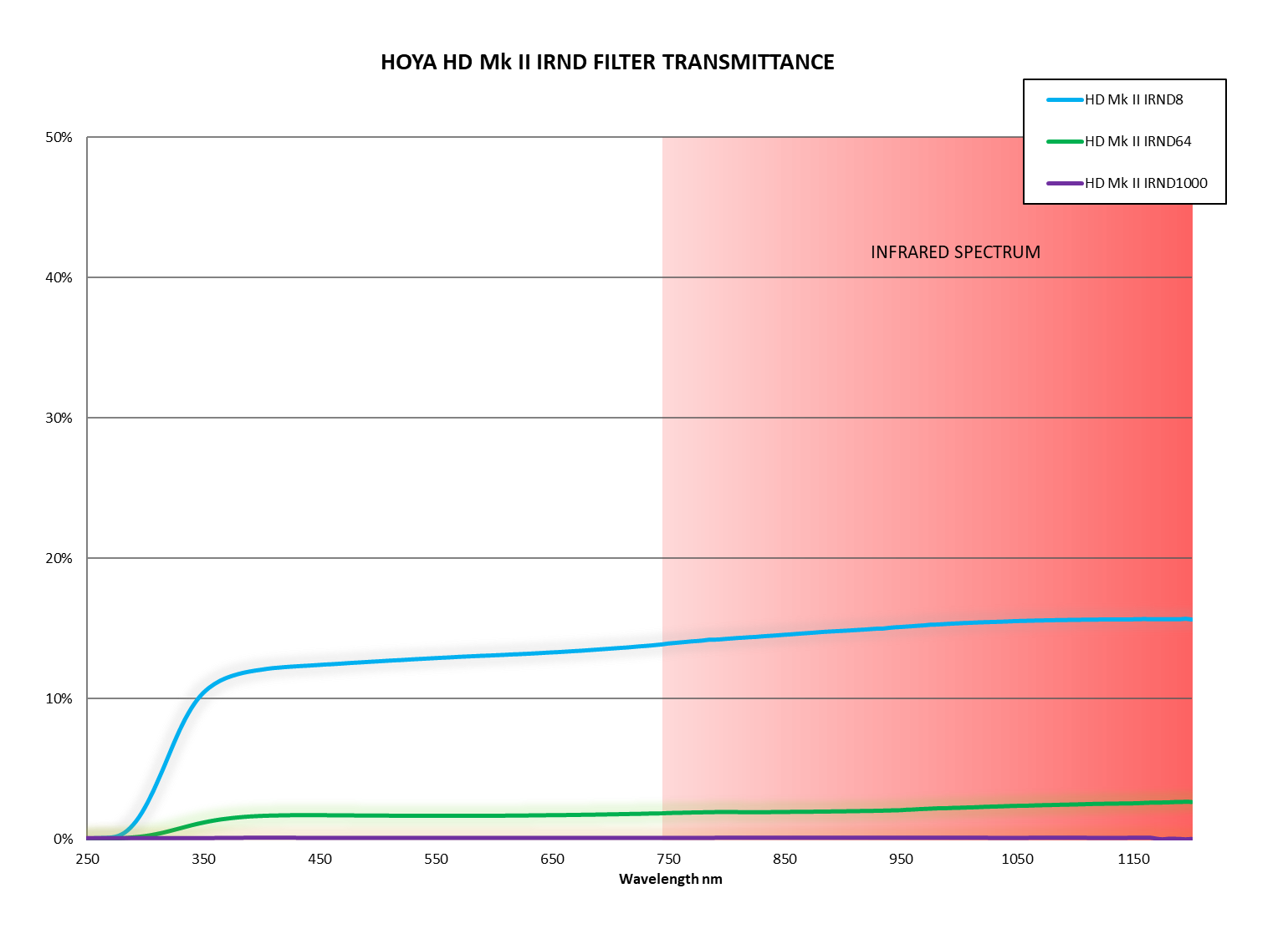 HOYA applies its signature ACCU-ND technology to the HD Mk II IRND series, guaranteeing an even light reduction throughout the visible light spectrum and up into the higher IR spectrum. This means that there is no leak from the infrared band of the light spectrum, guaranteeing that the image does not undergo any negative affect from color shifts.