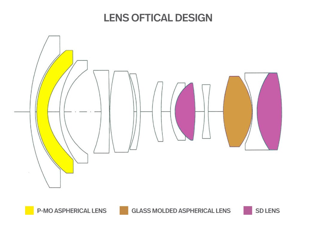 โครงสร้างเลนส์ออกแบบโดยการจัดเรียงชิ้นเลนส์ Asherical 2 ชิ้น และ Super low-dispersion (SD) 2 ชิ้น เข้ากับชิ้นเลนส์อื่นอย่างสมดุล เพื่อการถ่ายทอดสีสันที่สวยงาม การลด Chromatic Aberration (CA) อย่างมีประสิทธิภาพในขณะที่มี distortion น้อยและขอบมืดน้อยมากอีกด้วย