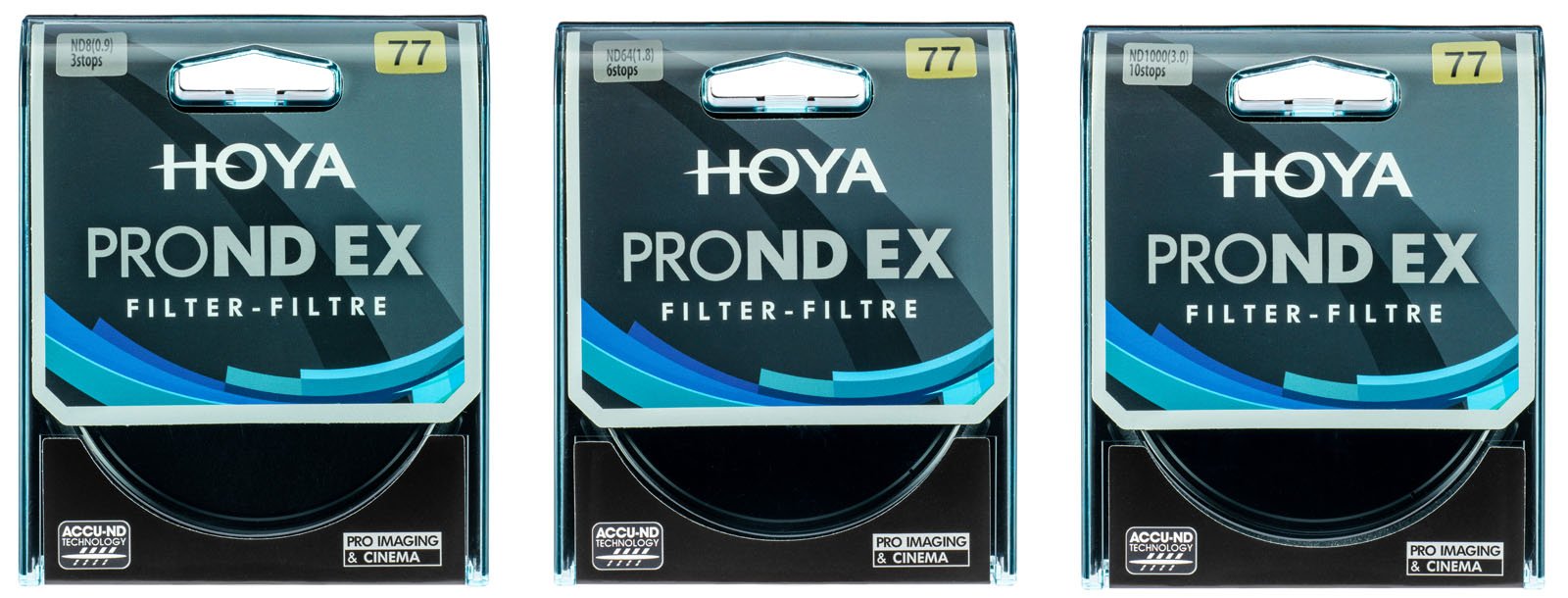 HOYA PROND EX filter series is designed for amateur or professional photographers and video content creators. Filters are sold individually (PROND EX 8, PROND EX 64 and PROND EX 1000) or as a kit. The kit consists of all 3 ND filters.