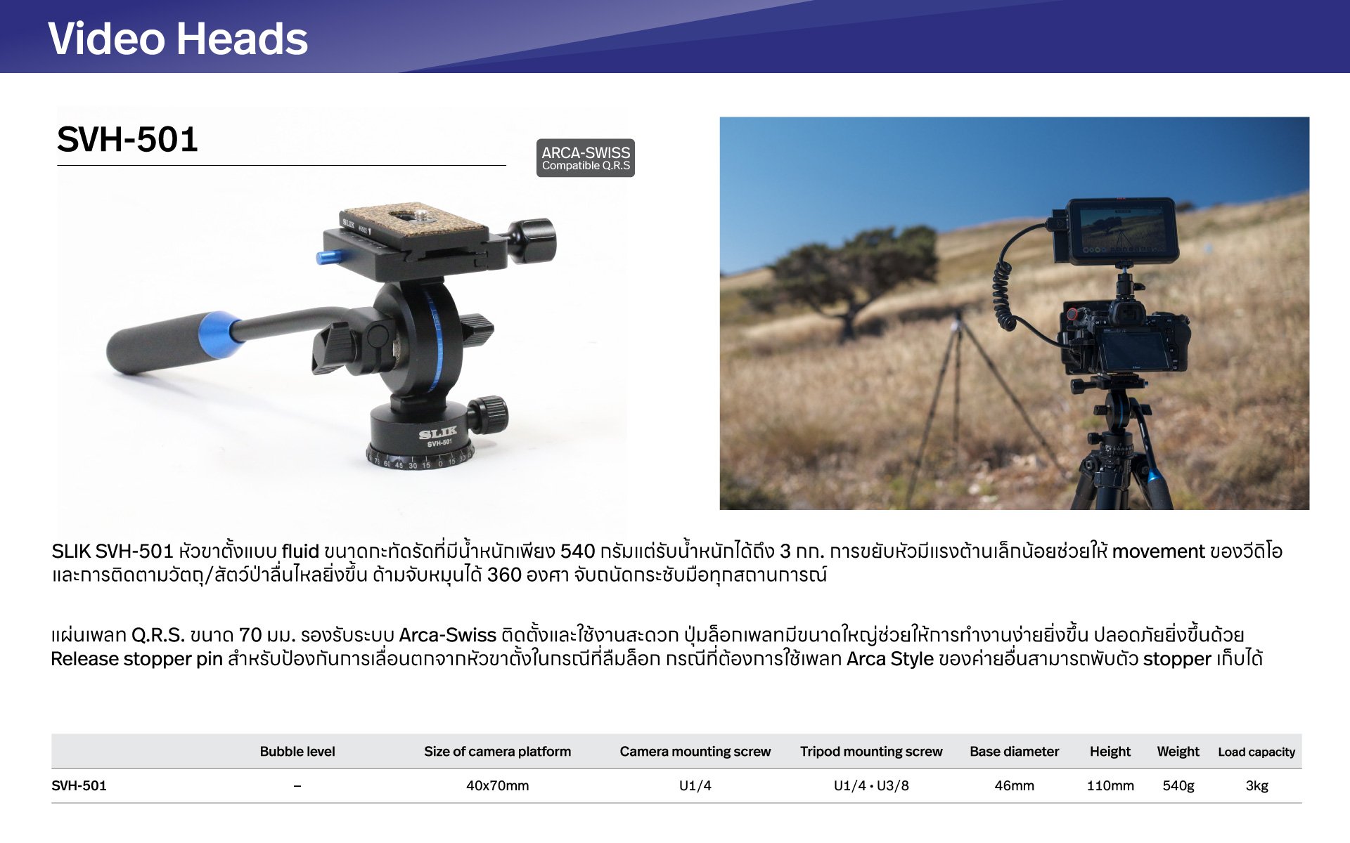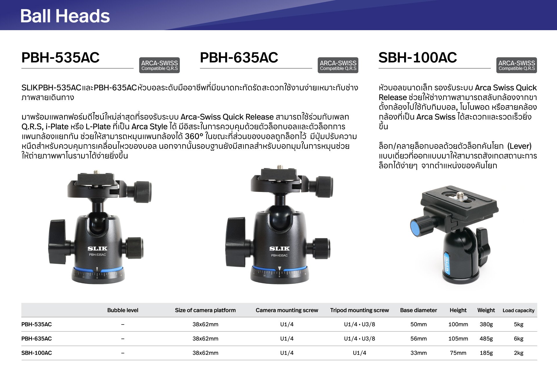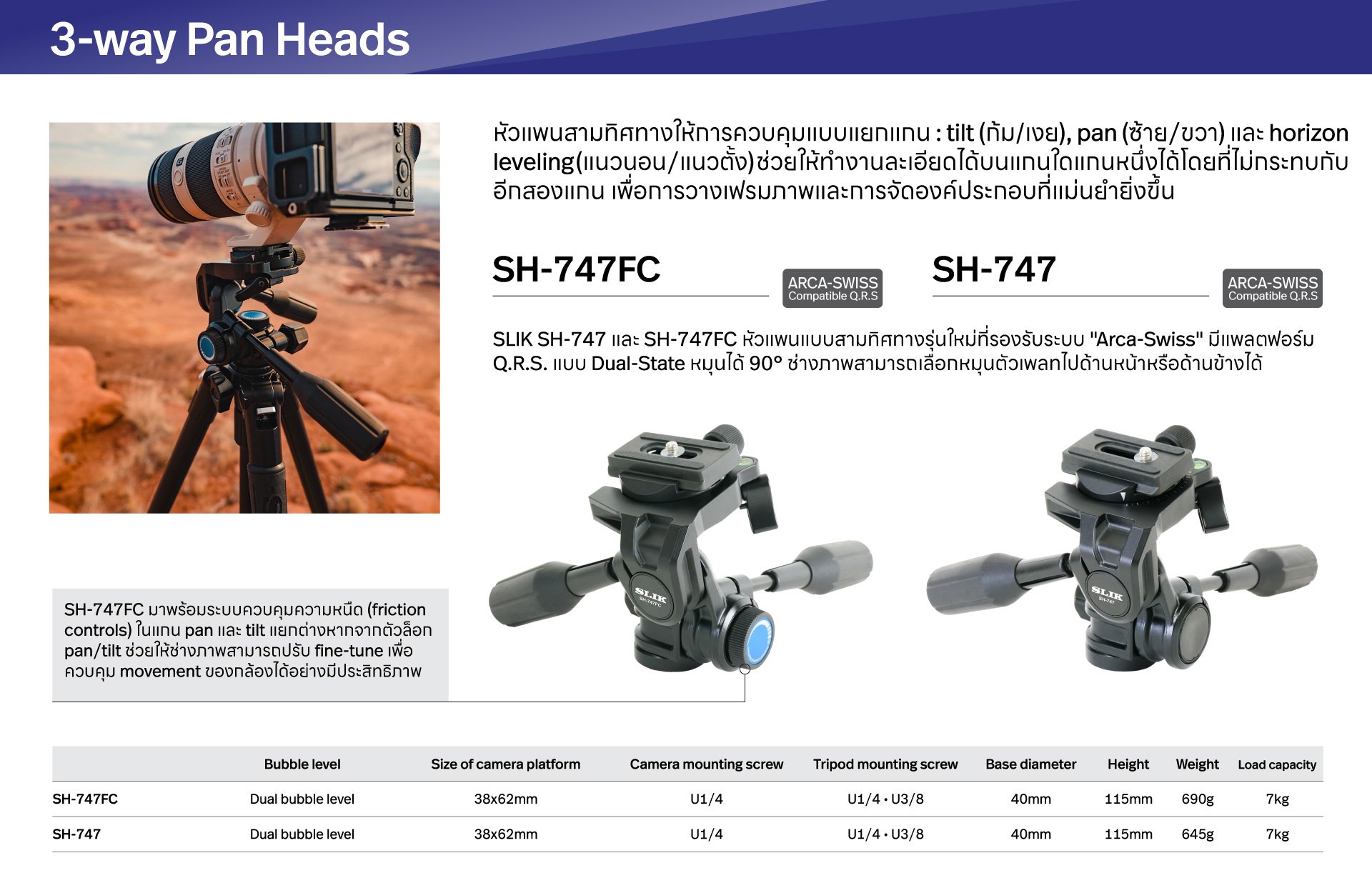 SLIK ออก "หัวขาตั้งกล้อง" ใหม่ล่าสุดหลายรุ่นรองรับ Arca-Swiss Quick Release ทุกค่ายเพื่อการใช้งานที่สะดวกรวดเร็วและง่ายยิ่งขึ้น มีให้เลือกใช้งานหลายประเภท ตอบโจทย์ทุกไลฟ์สไตล์การถ่ายภาพ อาทิ "หัวบอล" สำหรับช่างภาพที่ต้องการความคล่องตัวและอิสระขั้นสุดในการทำงาน, "หัวแพนสามทิศทาง (3-way pan head)" สำหรับช่างภาพสาย Landscape ที่ต้องการความละเอียดแม่นยำในการจัดองค์ประกอบภาพ และ "หัววีดิโอ" สำหรับช่างภาพสายวีดิโอโดยเฉพาะ