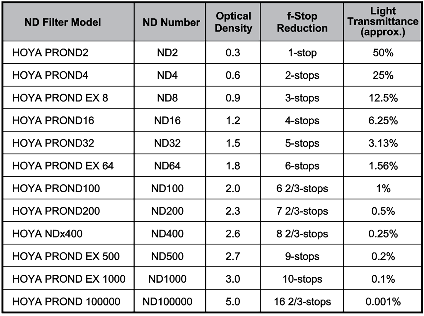 ฟิลเตอร์ ND มีหลายความเข้ม ตั้งแต่ ND4 ไปจนถึง ND100000 แต่โดยทั่วไปจะแบ่งได้ 3 กลุ่มหลักๆ ได้แก่ : ความเข้มน้อย, ปานกลาง และแบบเข้มมาก