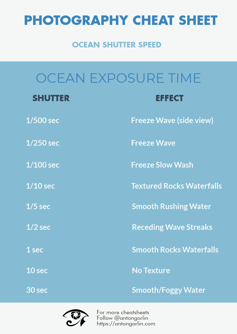 หมายเหตุ : ความเร็วชัตเตอร์เหล่านี้ใช้สำหรับอ้างอิงเบื้องต้นเท่านั้น ผลลัพธ์จริงๆ อาจแตกต่างออกไปเนื่องจากความเร็วและทิศทางของคลื่นแตกต่างกัน ลองใช้ค่าเหล่านี้ทดลองด้วยตัวเอง