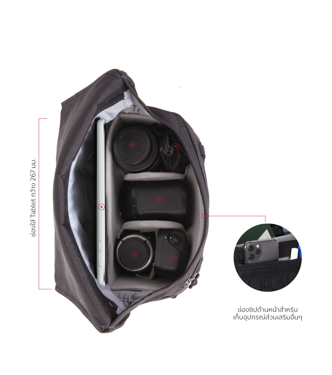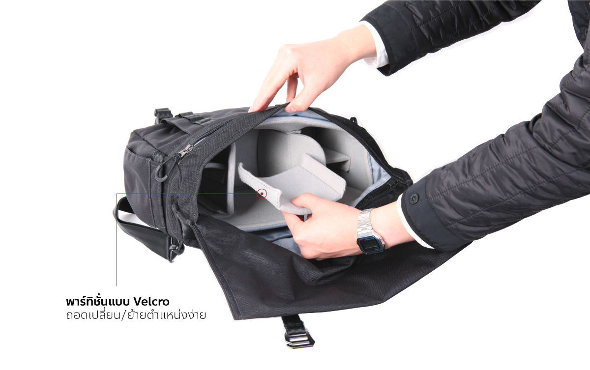 ภายในออกแบบโดยใช้พาร์ทิชั่น Velcro ที่สามารถถอดเปลี่ยนได้ง่ายดาย ผู้ใช้สามารถปรับแต่งพื้นที่จัดเก็บให้เข้ากับรูปแบบของอุปกรณ์และการใช้งานส่วนตัวได้อย่างอิสระ