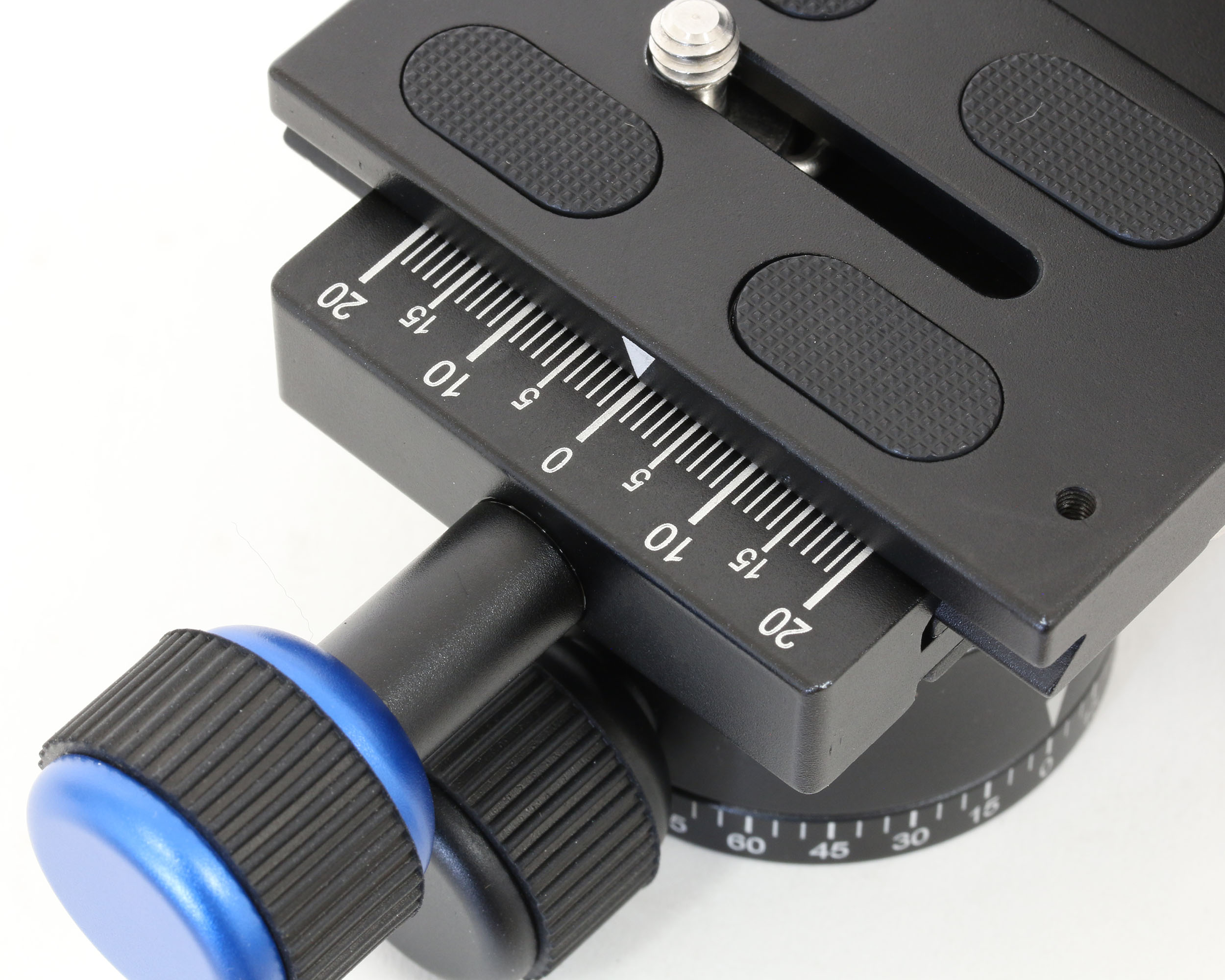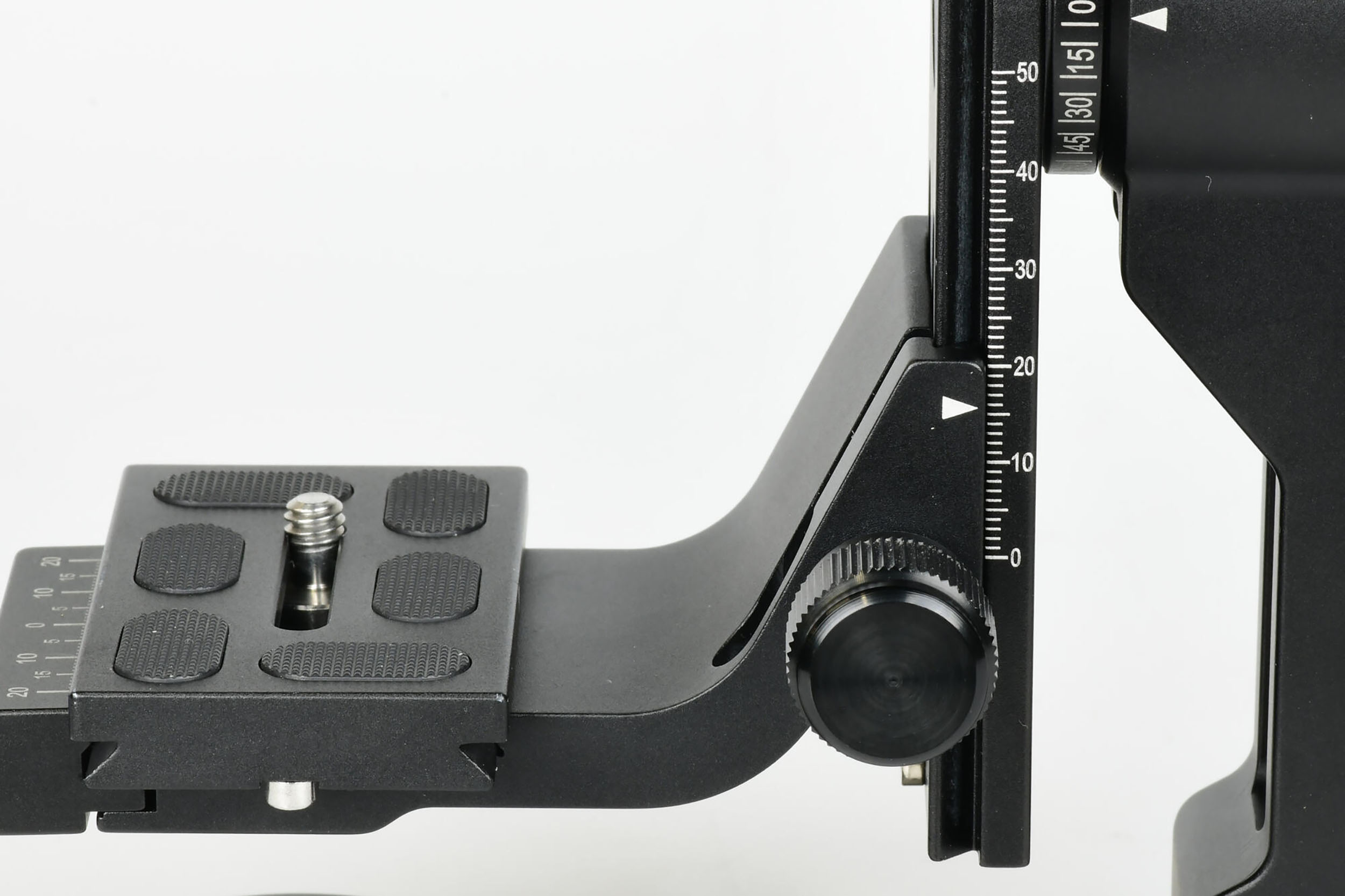 The height of the camera platform can be adjusted to align the optical axis of the lens to the tilting axis of the gimbal head. When the optical axis is aligned with the tilting axis, the camera can be set to hold in the vertical direction any position.