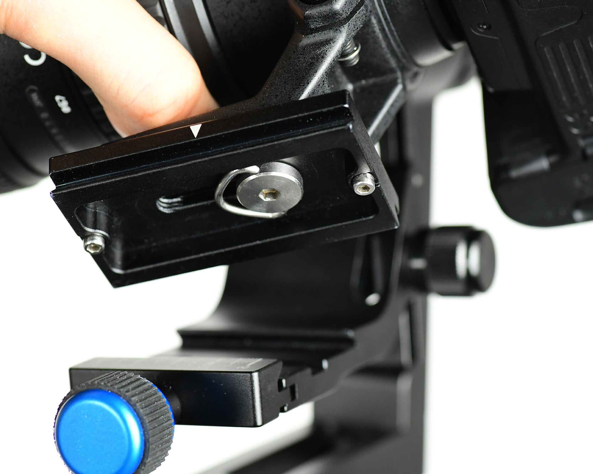 Consider the weight difference between the camera and the lens, and adjust the balance position front or back by sliding the quick shoe to align the center of gravity of the total load.