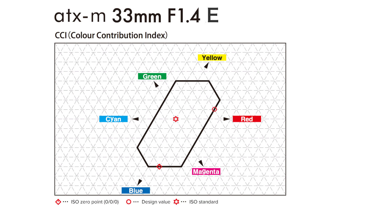 CCI means Color Contribution Index, that measures the light transmission values of the lens. Particularly, it is a three number system which describes the degree to which a lens is expected to change the overall color of a photograph relative to that obtained with no lens in the system. Compared to the location of the ISO standard point, actual value point tends to be closer to warm tones (Yellow, Red), but stays within the ideal coordinates that proves natural and well balanced color reproduction ability of the lens.