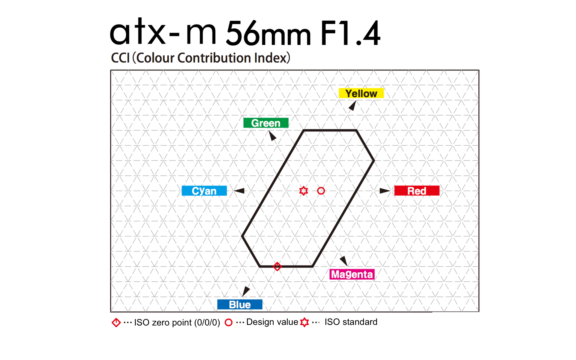 CCI means Color Contribution Index, that measures the light transmission values of the lens. Particularly, it is a three number system which describes the degree to which a lens is expected to change the overall color of a photograph relative to that obtained with no lens in the system. Compared to the location of the ISO standard point, actual value point tends to be closer to warm tones (Yellow, Red), but stays within the ideal coordinates that proves natural and well balanced color reproduction ability of the lens.