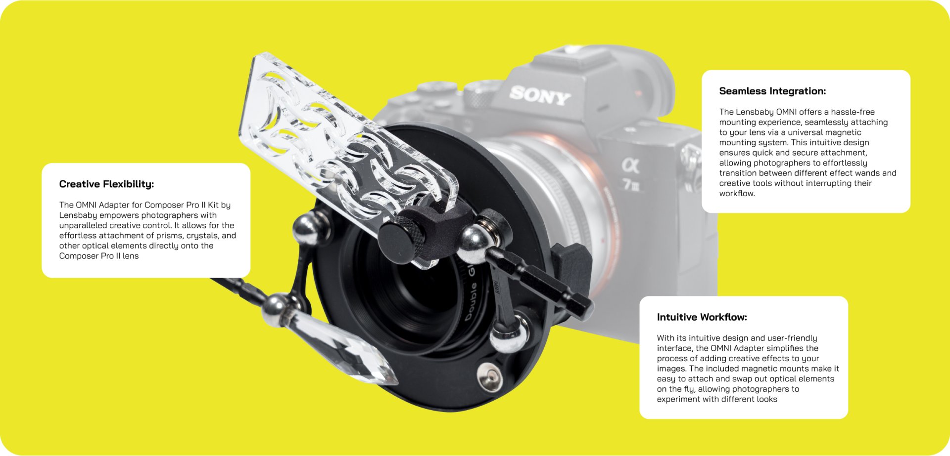 The OMNI Adapter for the Composer Pro II Kit puts all our OMNI effects at your fingertips while maintaining independent focus and aperture control when you use any Lensbaby Optic with the Composer Pro II. Whether youre a seasoned pro or just starting out, the ease of installation and removal will keep you in the zone, ready to capture that perfect shot with stunning effects from both optics and filters from OMNI. With lightning speed lock in your OMNI Ring, small ring included, with your Composer Pro II OMNI Filter Adapter. This innovative design bypasses the standard extending focus mechanism, delivering an ultra-strong connection that can withstand any photoshoot. Brace yourself for an explosion of creativity as you layer lens effects with multiple layers of OMNI Filter magic.