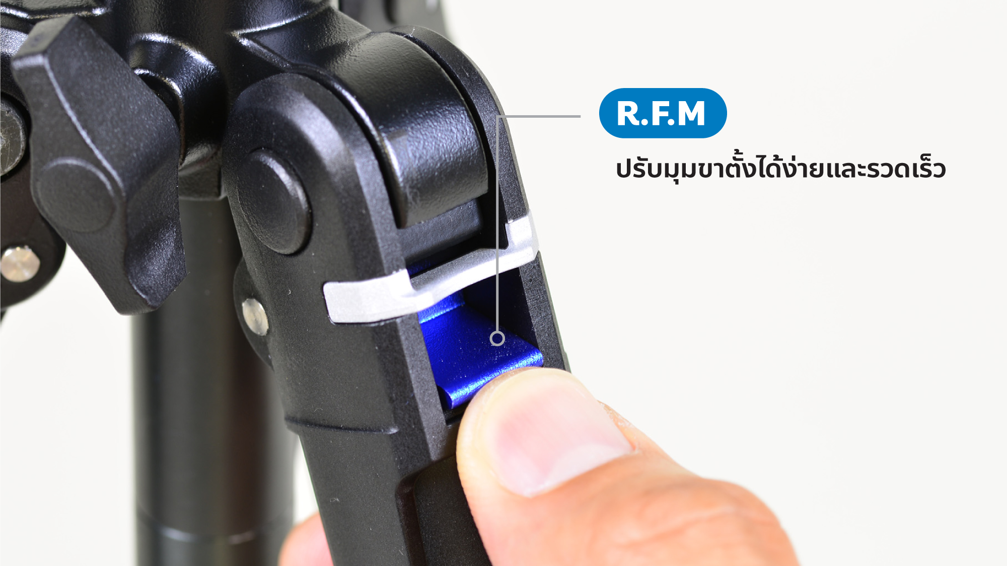 ปรับมุมขาตั้งได้ง่ายและรวดเร็วด้วยระบบ R.F.M (Rapid Flip Mechanism) Flip แค่ครั้งเดียวก็สามารถจัดตำแหน่งขาตั้งกล้องได้ถึงทั้ง 3 ระดับ