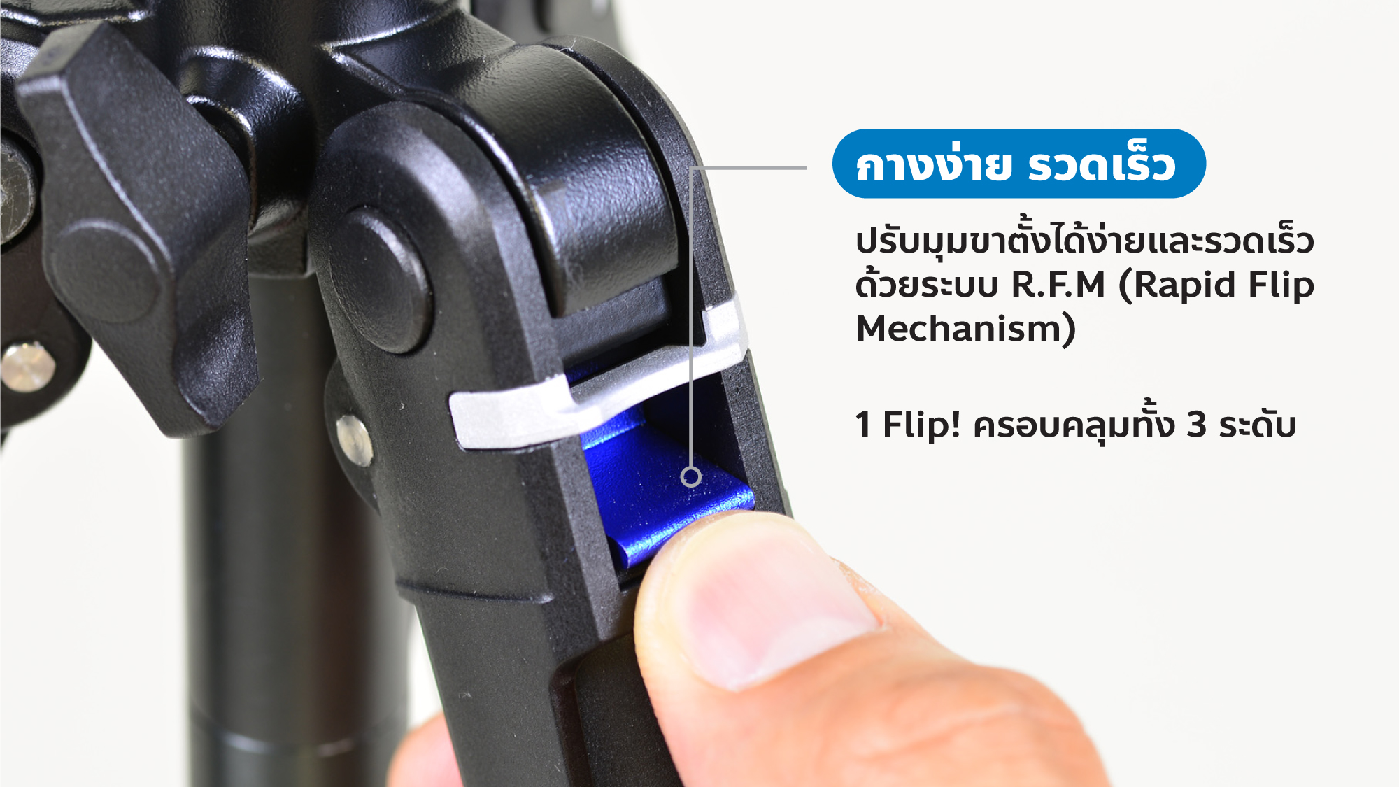 ปรับมุมขาตั้งได้ง่ายและรวดเร็วด้วยระบบ R.F.M (Rapid Flip Mechanism) Flip แค่ครั้งเดียวก็สามารถจัดตำแหน่งขาตั้งกล้องได้ถึงทั้ง 3 ระดับ