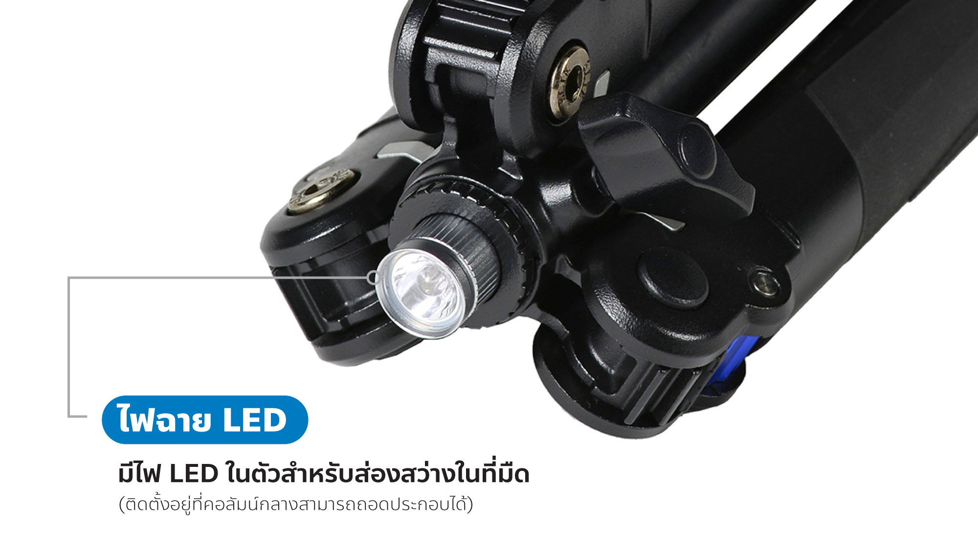SLIK LiTE CF-422 ขาตั้งกล้องคาร์บอนไฟเบอร์ขนาดเล็กสำหรับสายออกทริปท่องเที่ยวที่มีไฟฉายในตัว (ถอดได้) เพื่อให้แสงสว่างในตอนกลางคืน มาพร้อมดีไซน์การจัดเก็บแบบพลิกกลับ 180° ทำให้ขาตั้งกล้องมีวงรอบที่เล็กกว่าการจัดเก็บแบบปกติ กระทัดรัด จัดเก็บง่าย พกพาเดินทางสะดวกยิ่งขึ้น
