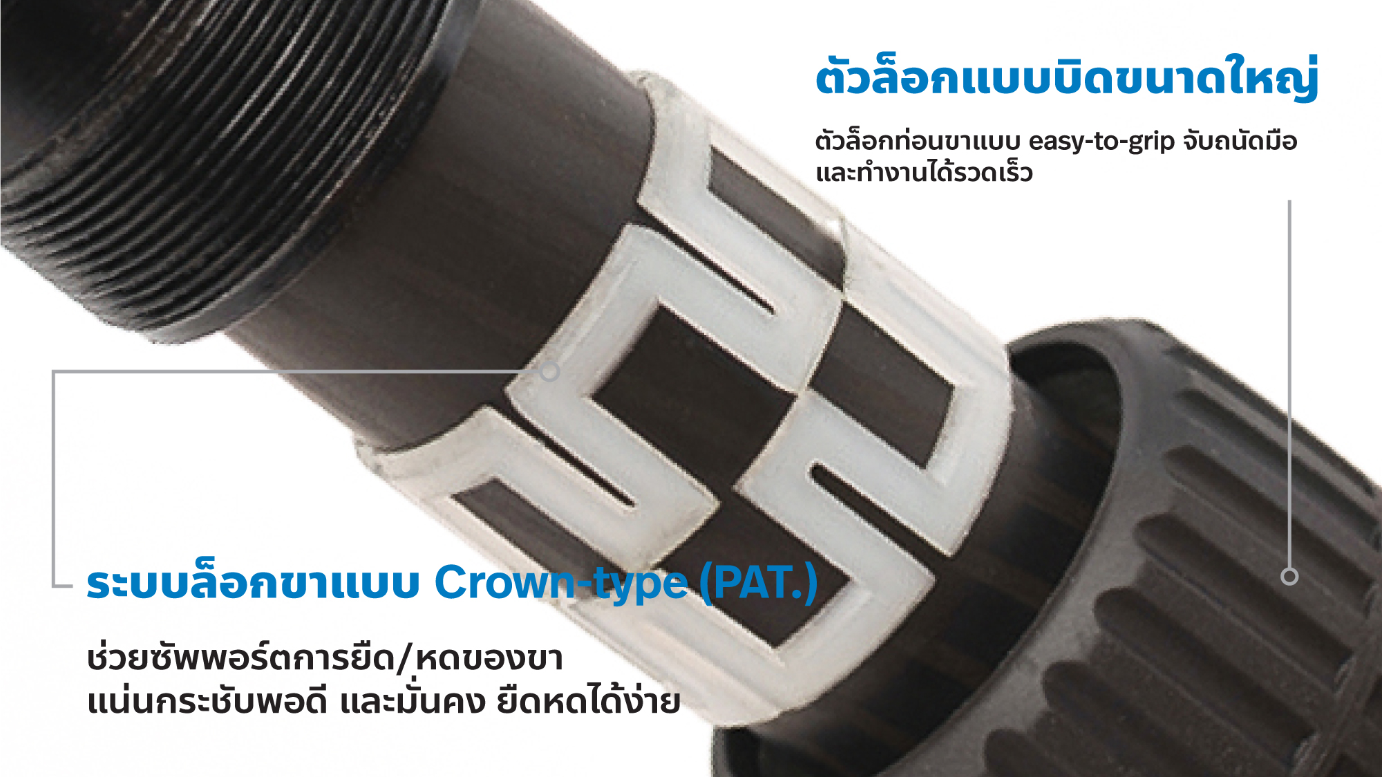 ระบบล็อกแบบบิด (Twist lock) ด้วยแหวนนัท Crown type คู่ ช่วยซัพพอร์ตการยืด/หดของขาแต่ละท่อนให้มีความแน่นกระชับแน่น มั่นคง และยืดหดได้ลื่นไหล