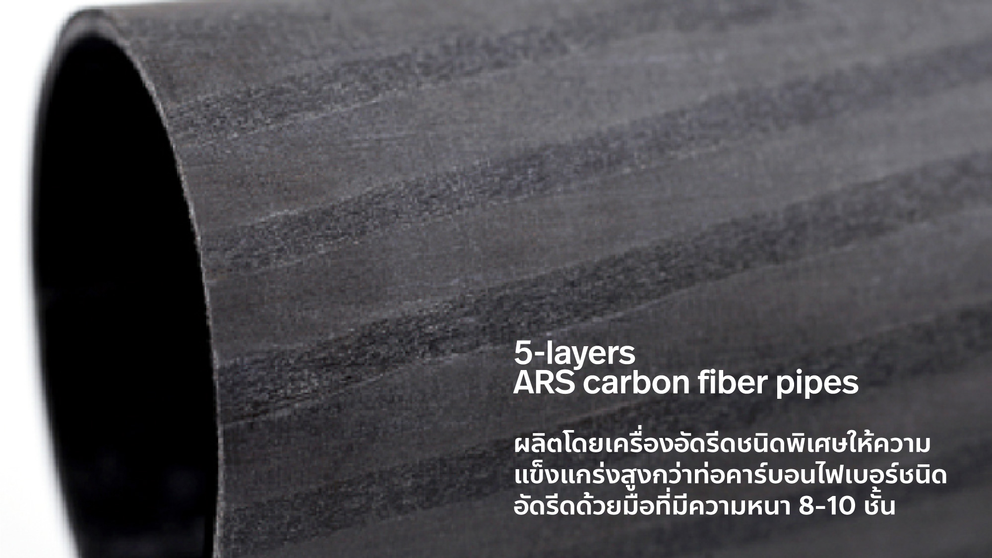 ผลิตโดยเครื่องอัดรีดชนิดพิเศษให้ความแข็งแกร่งสูงกว่าท่อคาร์บอนไฟเบอร์ที่มีความหนา 8-10 ชั้นที่อัดรีดด้วยมือ
