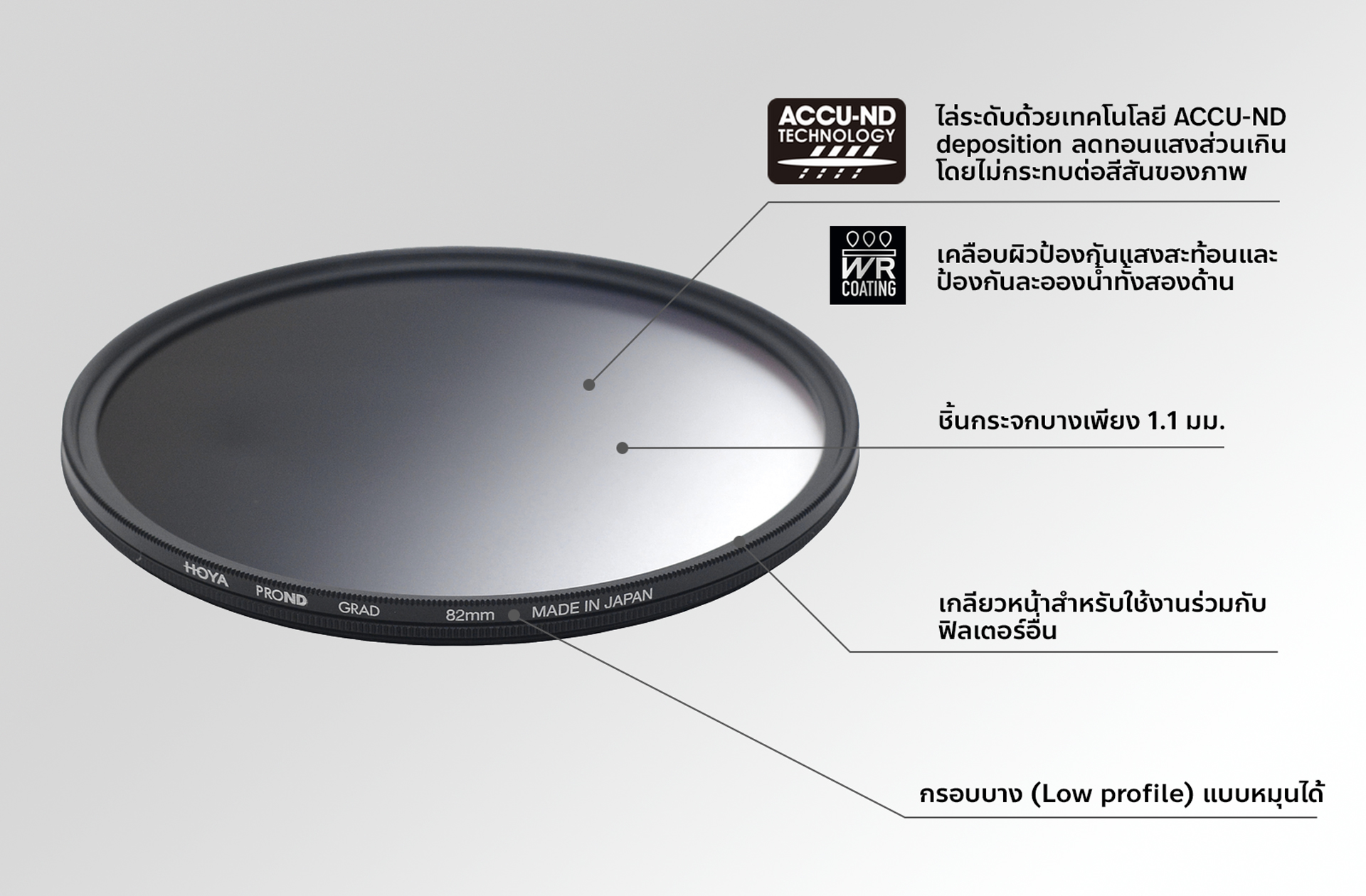 HOYA ProND Filter เป็นผลิตภัณฑ์เทคโนโลยีระดับสูงสำหรับการถ่ายภาพนิ่ง และวีดิโอ ฟิลเตอร์ ProND ใช้กระจกออปติคัลใสคุณภาพสูงเอกสิทธิ์เฉพาะของ HOYA ผสมผสานกับการเคลือบโลหะ (Metallic coating) ทั้งด้านหน้าและด้านหลังเพื่อลดช่วงแสงเกือบทั้งหมดในช่วง Infrared (IR) เทคโนโลยี ACCU-ND ใช้กระบวนการเคลือบผิวพิเศษที่ช่วยถ่ายทอดสมดุลสีเป็นกลาง ถูกต้องสมจริงและเป็นธรรมชาติ โดยไม่ส่งผลกระทบใดกับภาพ