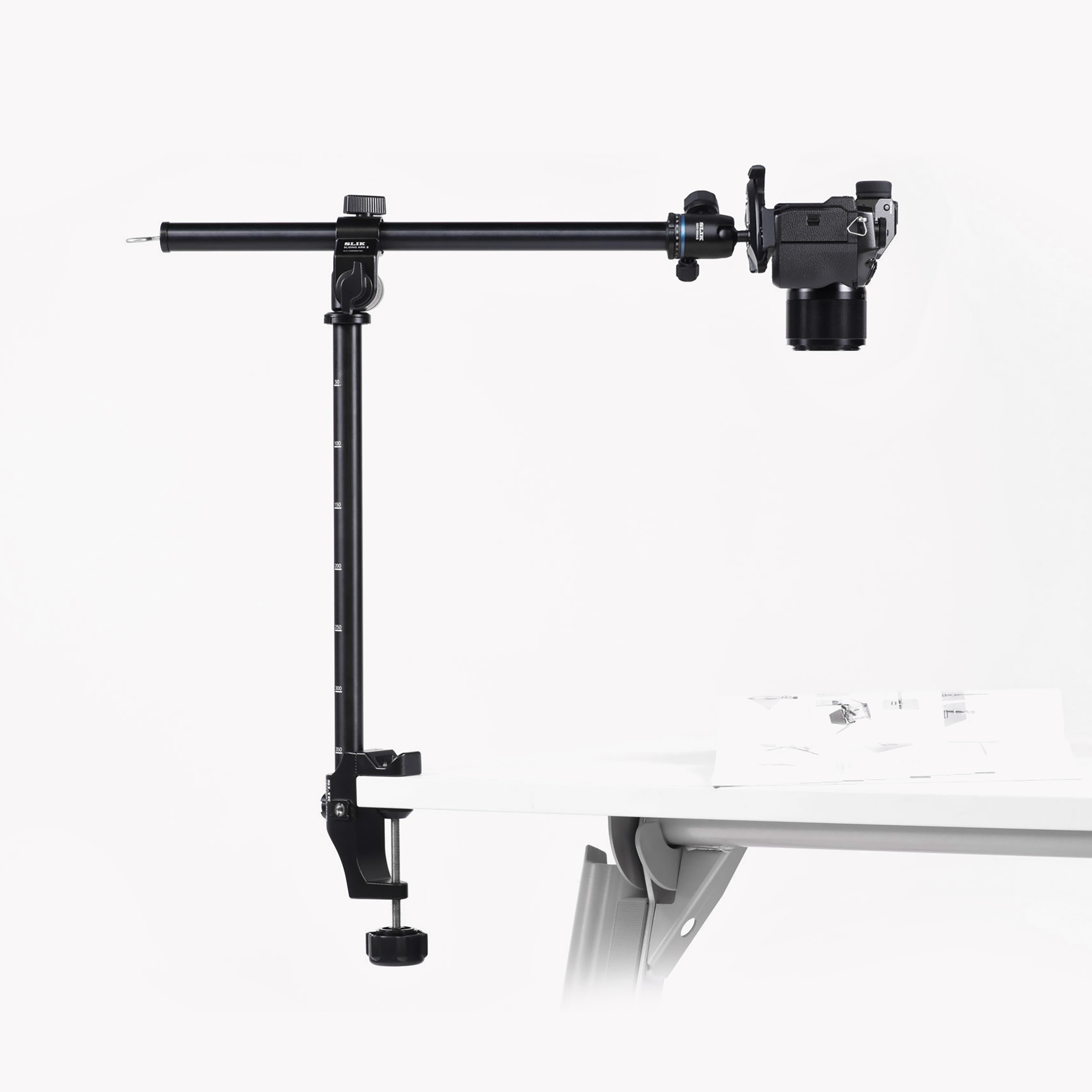 ใช้ Sliding Arm II ร่วมกับ Clamp จับเข้ากับขอบโต๊ะโดยตรงก็สามารถถ่ายภาพด้วยมุมมอง Bird's Eye View ได้โดยไม่ต้องเปลืองพื้นที่