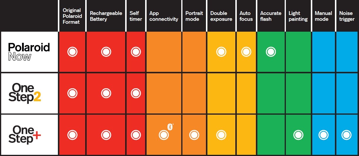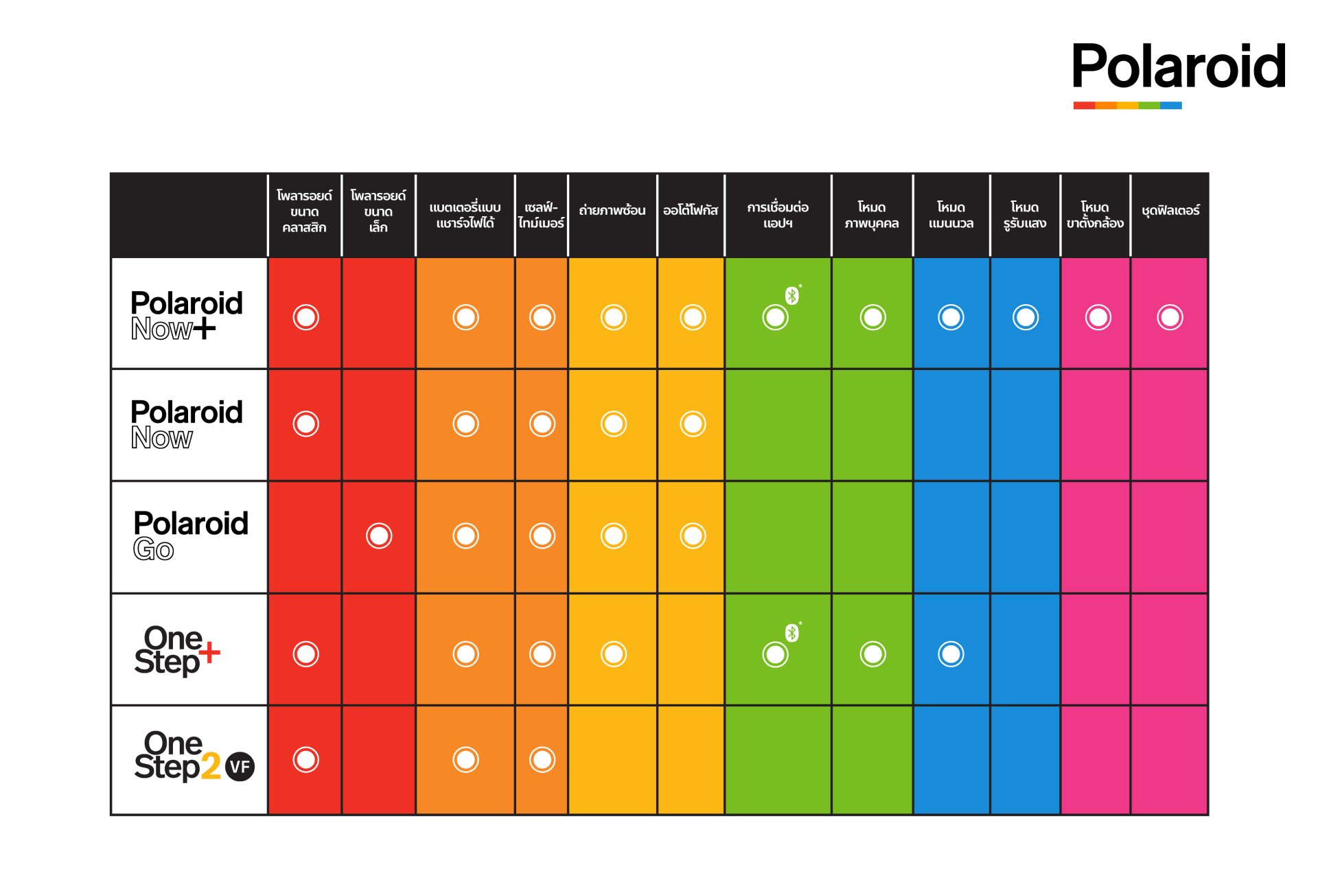ตารางเปรียบเทียบฟีเจอร์ของกล้องโพลารอยด์แต่ละรุ่น